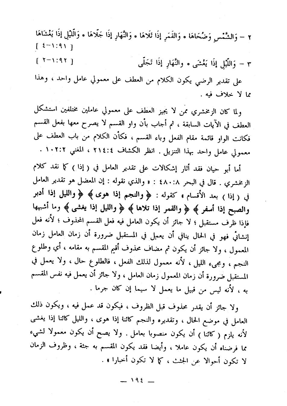 أما أبو حيان فقد أثار إشكالات على تقدير العامل في (إذا) كما نقد كلام الزمخشري. قال في البحر 8: 480: «والذي نقوله: إن المعضل هو تقدير العامل في (إذا) بعد الأقسام» كقوله: {والنجم إذا هوى} {والليل إذا أدبر والصبح إذا أسفر} {والقمر إذا تلاها} {والليل إذا يغشى} وما أشبهها فإذا ظرف مستقبل؛ لا جائز أن يكون العامل فيه فعل القسم المحذوف؛ لأنه فعل إنشائي فهو في الحال ينافي أن يعمل في المستقبل ضرورة أن زمان العامل زمان المعمول، ولا جائز أن يكون ثم مضاف محذوف أقيم المقسم به مقامه، أي وطلوع النجم، ومجيء الليل، لأنه معمول لذلك الفعل، فالطلوع حال، ولا يعمل في المستقبل ضرورة أن زمان المعمول زمان العامل، ولا جائز أن يعمل فيه نفس المقسم به، لأنه ليس من قبيل ما يعمل لا سيما إن كان جرمًا.
