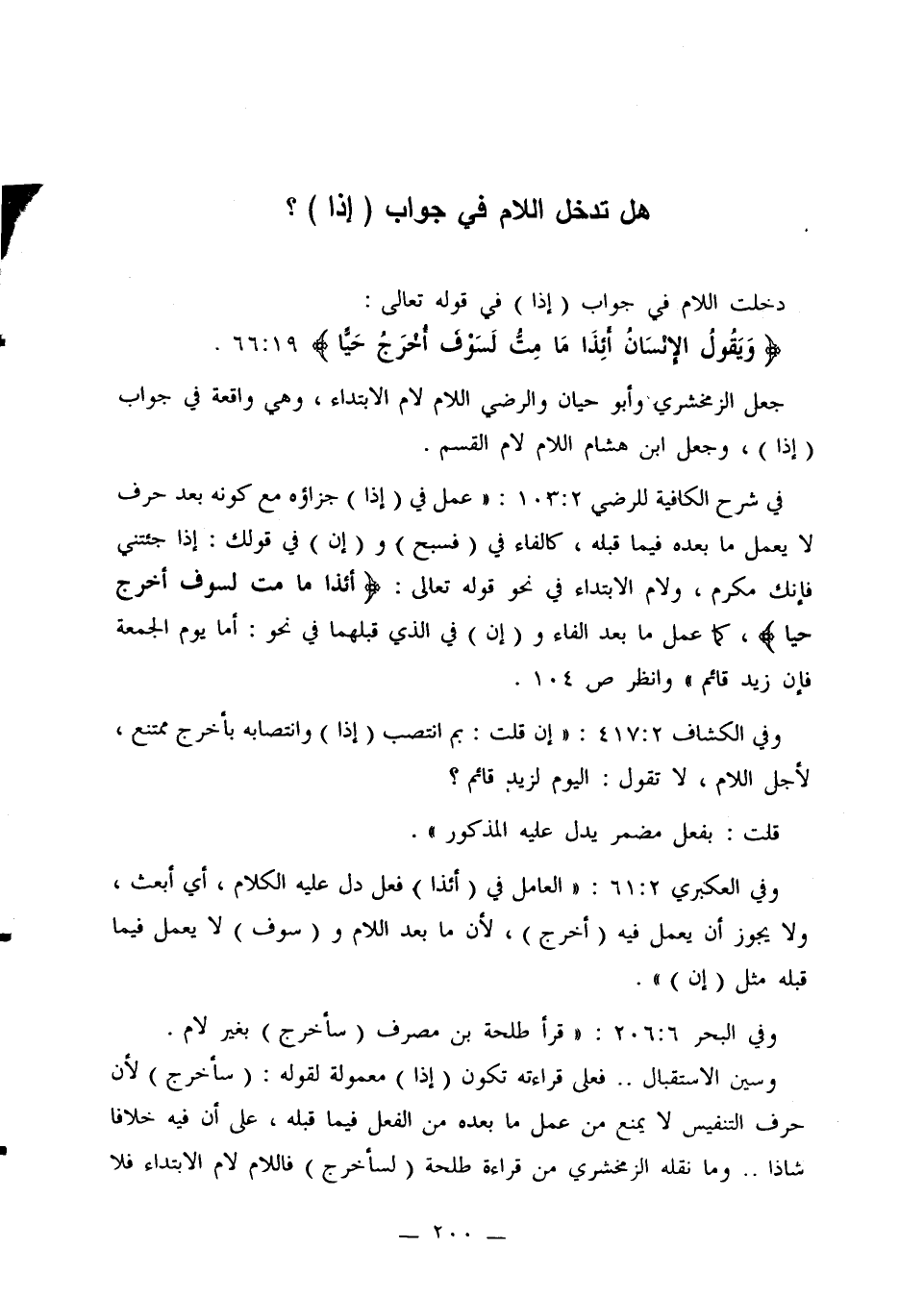 وفي العكبري 2: 61: «العامل في (أئذا) فعل دل عليه الكلام، أي أبعث، ولا يجوز أن يعمل فيه (أخرج)، لأن ما بعد اللام و (سوف) لا يعمل فيما قبله مثل (إن)».