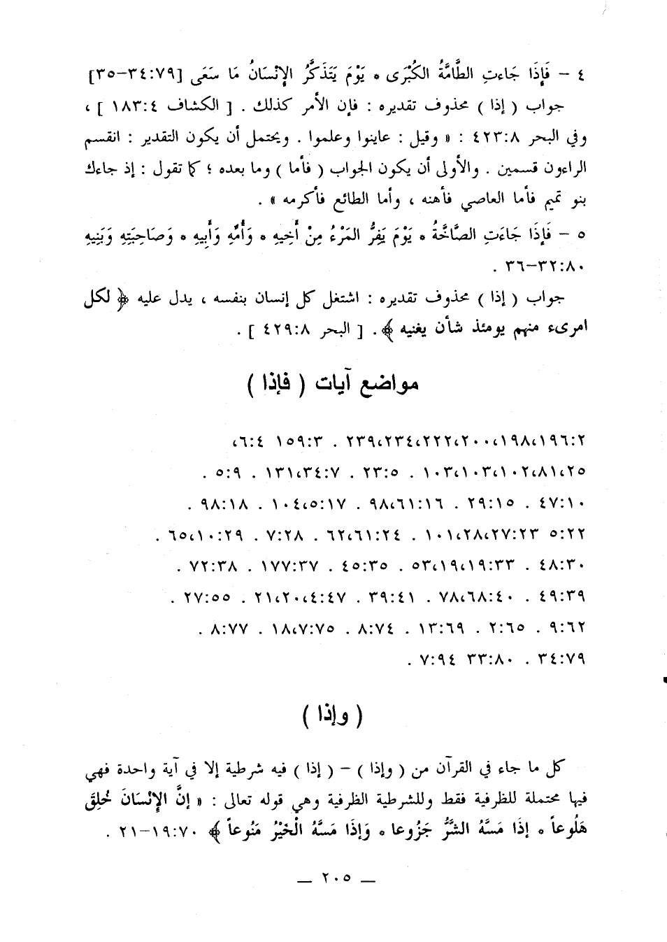 كل ما جاء في القرآن من (وإذا) - (إذا) فيه شرطية إلا في آية واحدة فهي فيها محتملة للظرفية فقط وللشرطية الظرفية وهي قوله تعالى: {إن الإنسان خلق هلوعا* إذا مسه الشر جزوعا* وإذا مسه الخير منوعا} 70: 19 - 22.