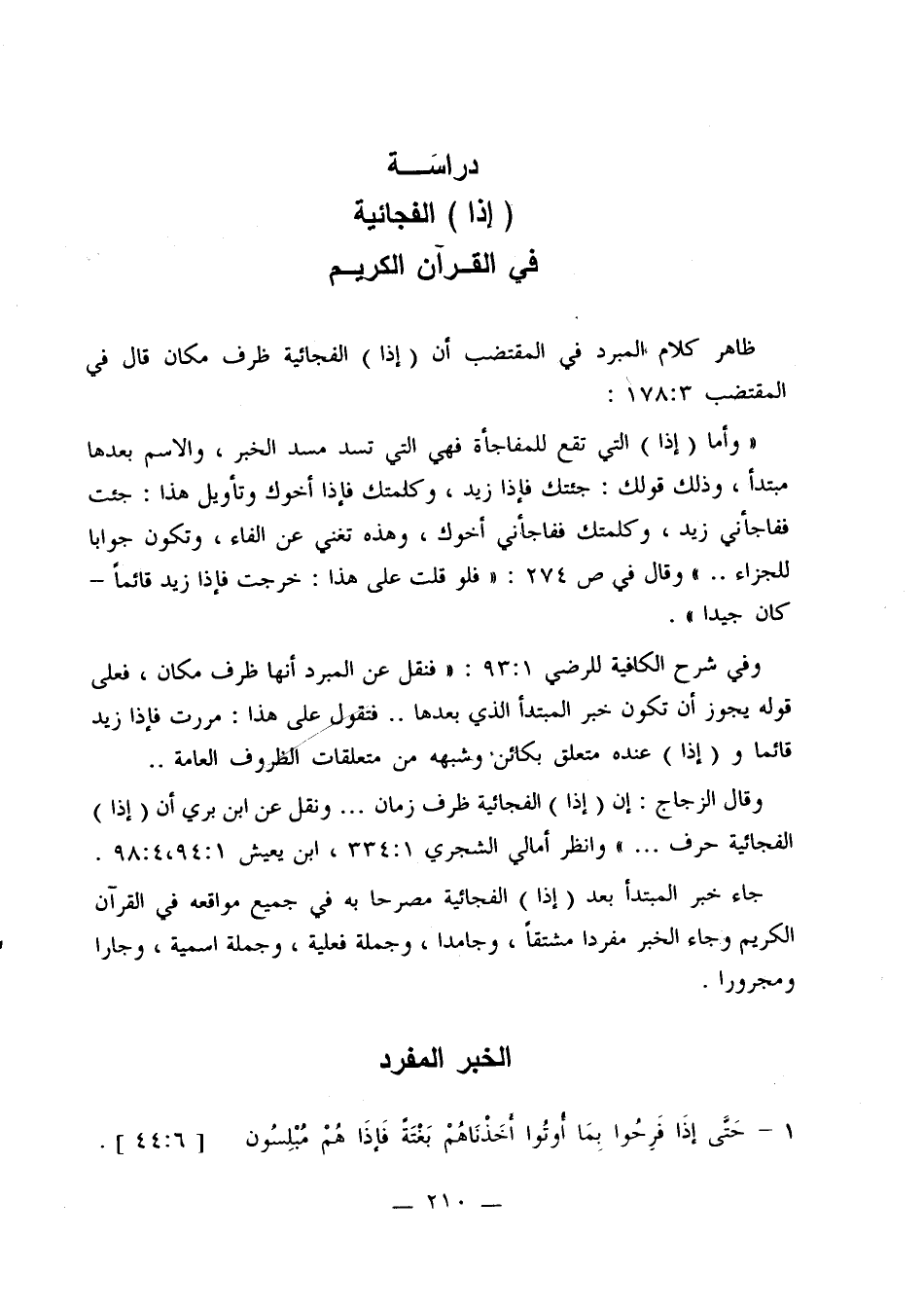 «وأما (إذا) التي تقع للمفاجأة فهي التي تسد مسد الخبر، والاسم بعدها مبتدأ، وذلك قولك: جئتك فإذا زيد، وكلمتك فإذا أخوك وتأويل هذا: جئت ففاجأني زيد، وكلمتك ففاجأني أخوك، وهذه تغني عن الفاء، وتكون جوابا للجزاء ..» وقال في ص 274: «فلو قلت على هذا: خرجت فإذا زيد قائما- كان جيدًا».