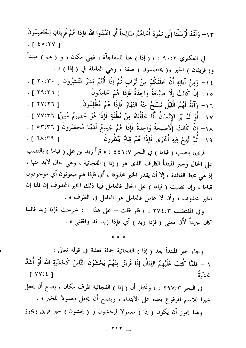 13 - {ولقد أرسلنا إلى ثمود أخاهم صالحا أن أعبدوا الله فإذا هم فريقان يختصمون} [27: 45]. في العكبري 2: 90: «(إذا) هنا للمفاجأة، فهي مكان؛ و (هم) مبتدأ و (فريقان) الخبر و (يختصمون) صفة، وهي العاملة في (إذا)».