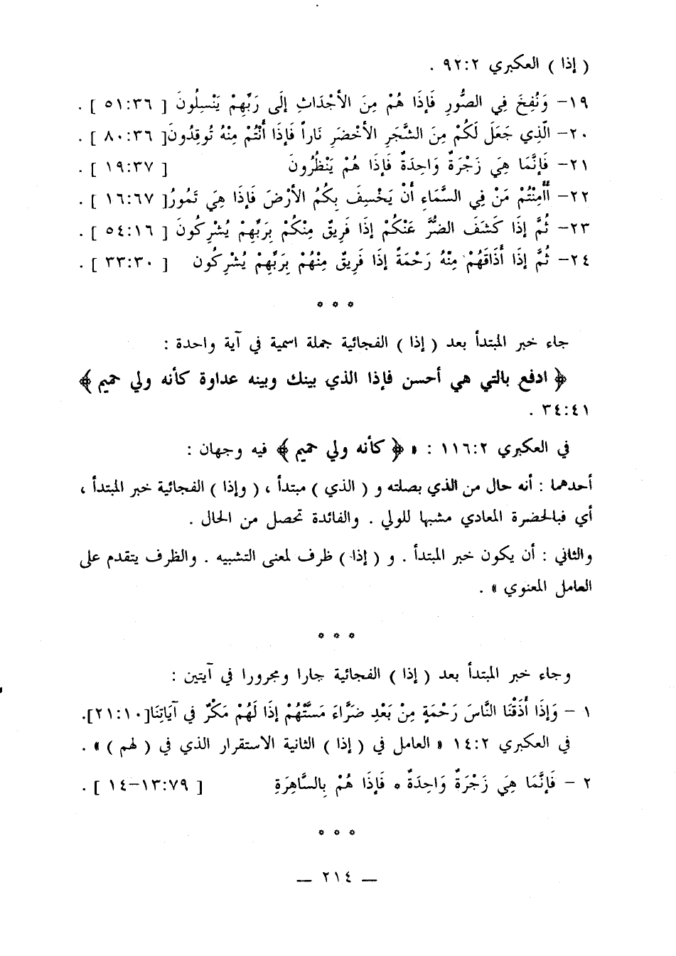 1 - {وإذا أذقنا الناس رحمة من بعد ضراء مستهم إذا لهم مكر في آياتنا} [10: 21]. في العكبري 2: 14 «العامل في (إذا) الثانية الاستقرار الذي في (لهم)».