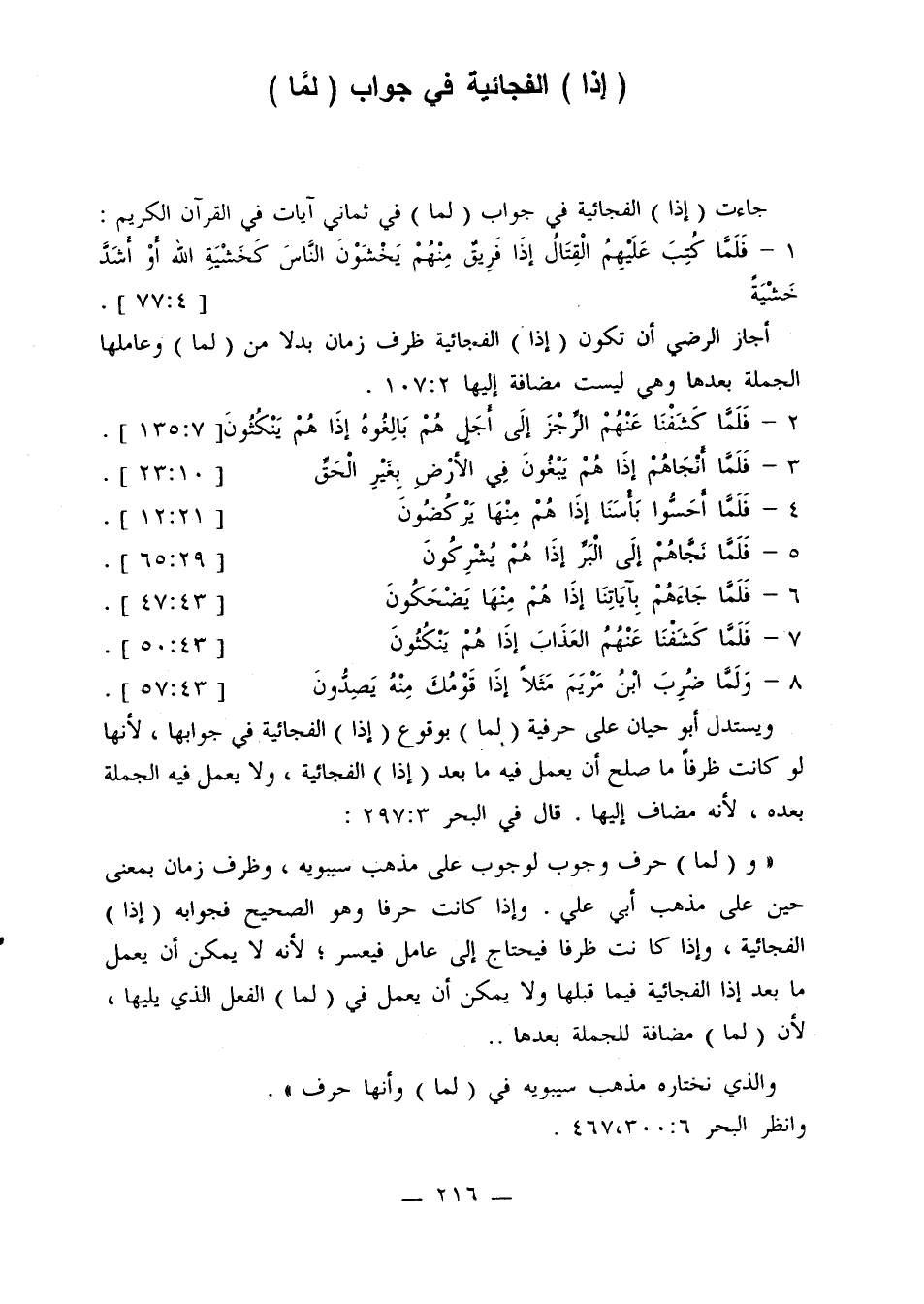 ويستدل أبو حيان على حرفية (لما) بوقوع (إذا) الفجائية في جوابها، لأنها لو كانت ظرفا ما صلح أن يعمل فيه ما بعد (إذا) الفجائية، ولا يعمل فيه الجملة بعده، لأنه مضاف إليها. قال في البحر 3: 297: