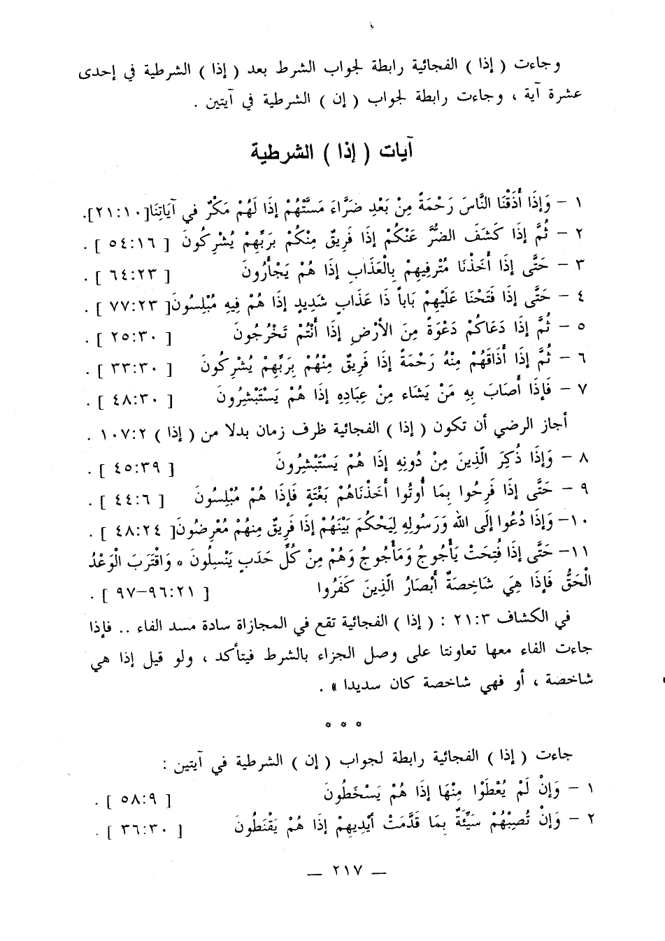 7 - {فإذا أصاب به من يشاء من عباده إذا هم يستبشرون} [30: 48]. أجاز الرضي أن تكون (إذا) الفجائية ظرف زمان بدلا من (إذا) [2: 107].