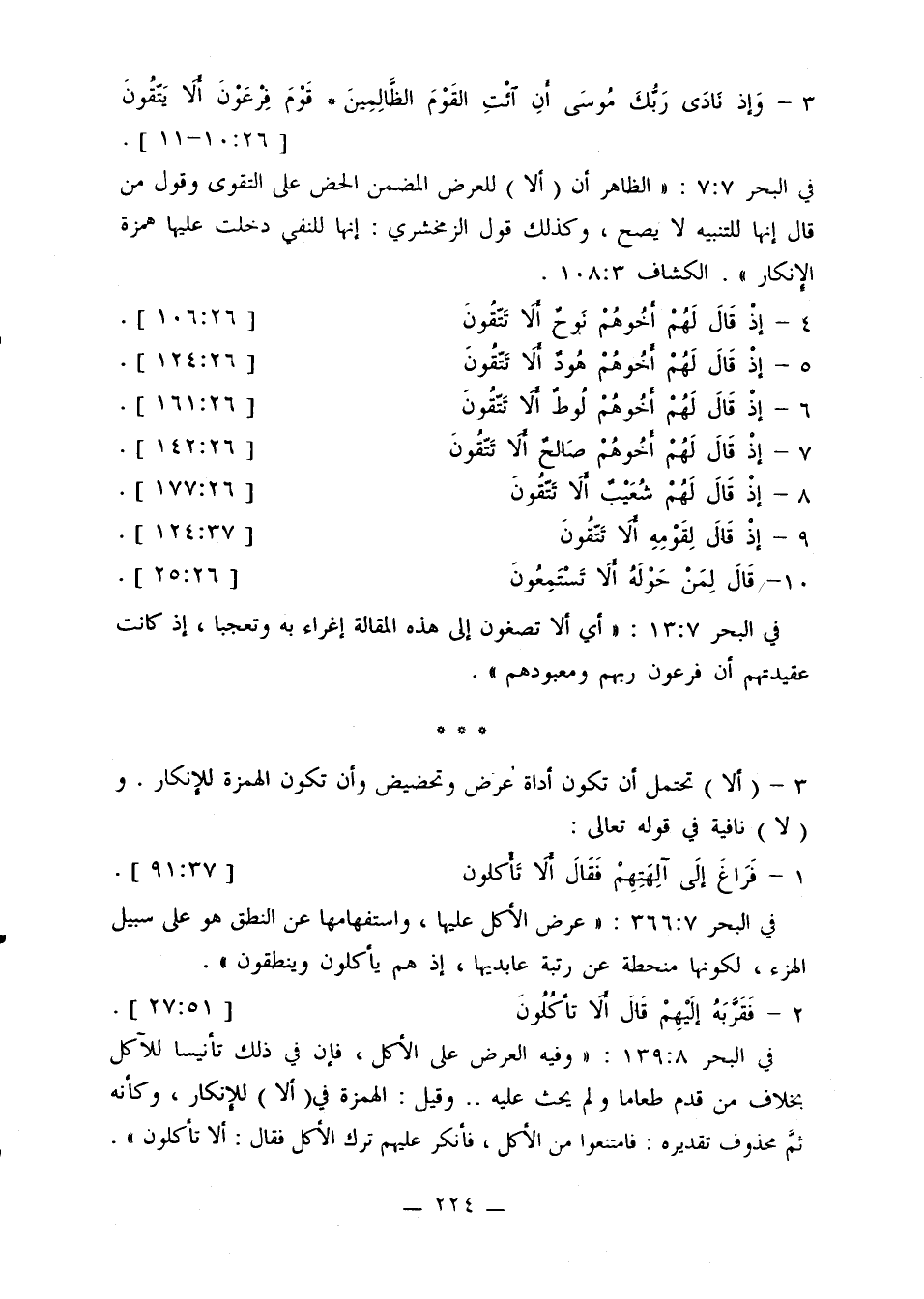 3 - {وإذ نادى ربك موسى أن ائت القوم الظالمين* قوم فرعون ألا يتقون} [26: 10 - 11]. في البحر [7: 7]: «الظاهر أن (ألا) للعرض المضمن الحض على التقوى وقول من قال إنها للتنبيه لا يصح، وكذلك قول الزمخشري: إنها للنفي دخلت عليها همزة الإنكار». الكشاف [3: 108].