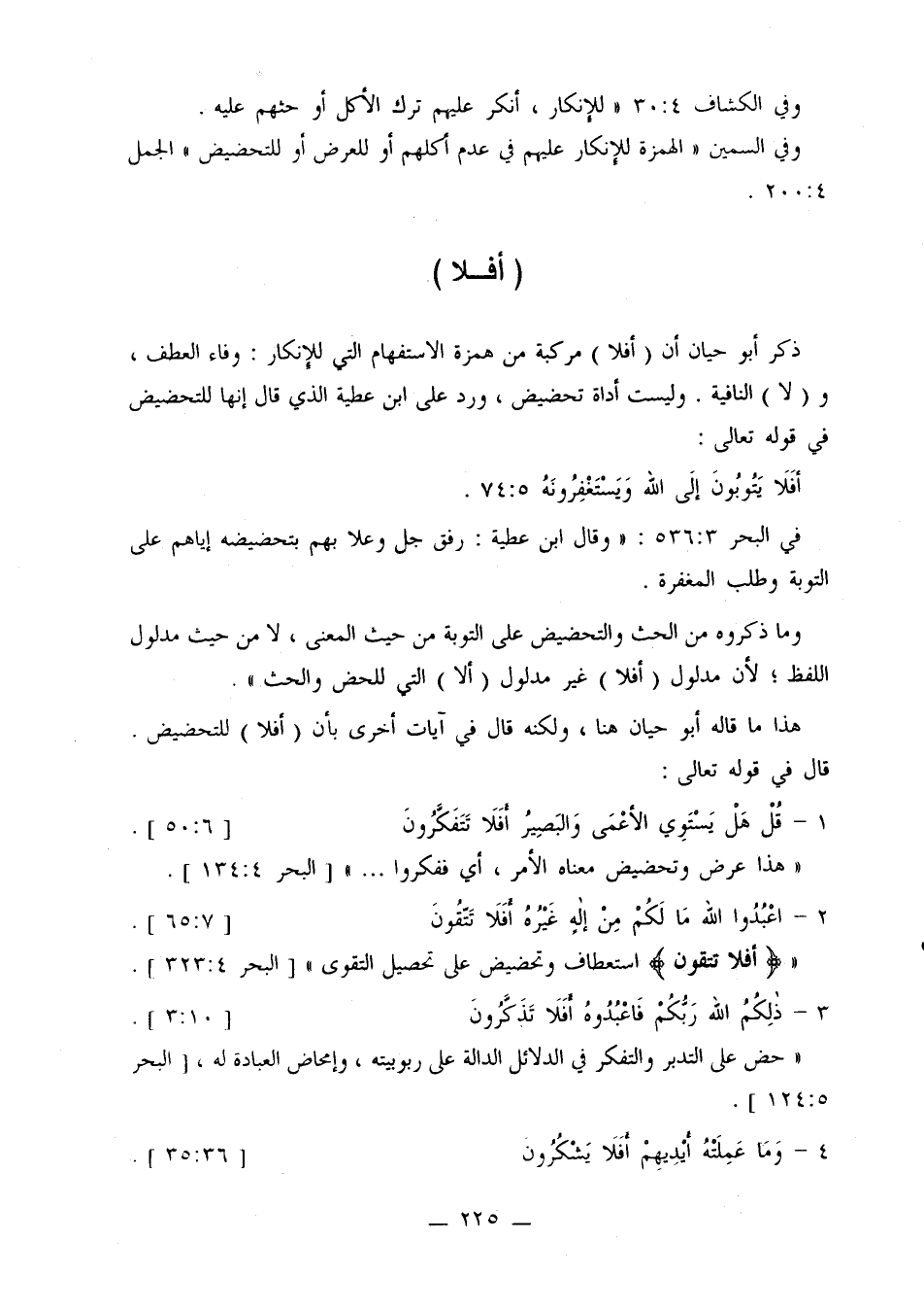 ذكر أبو حيان أن (أفلا) مركبة من همزة الاستفهام التي للإنكار: وفاء العطف، و (لا) النافية. وليست أداة تحضيض، ورد على ابن عطية الذي قال إنها للتحضيض في قوله تعالى: