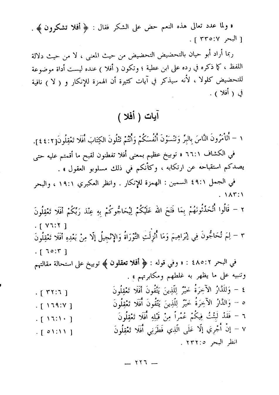 1 - {أتأمرون الناس بالبر وتنسون أنفسكم وأنتم تتلون الكتاب أفلا تعقلون} [2: 44]. في الكشاف [1: 66]. «توبيخ عظيم أفلا تفطنون لقبح ما أقمتم عليه حتى يصدكم استقباحه عن ارتكابه، وكأنكم في ذلك مسلوبو العقول».