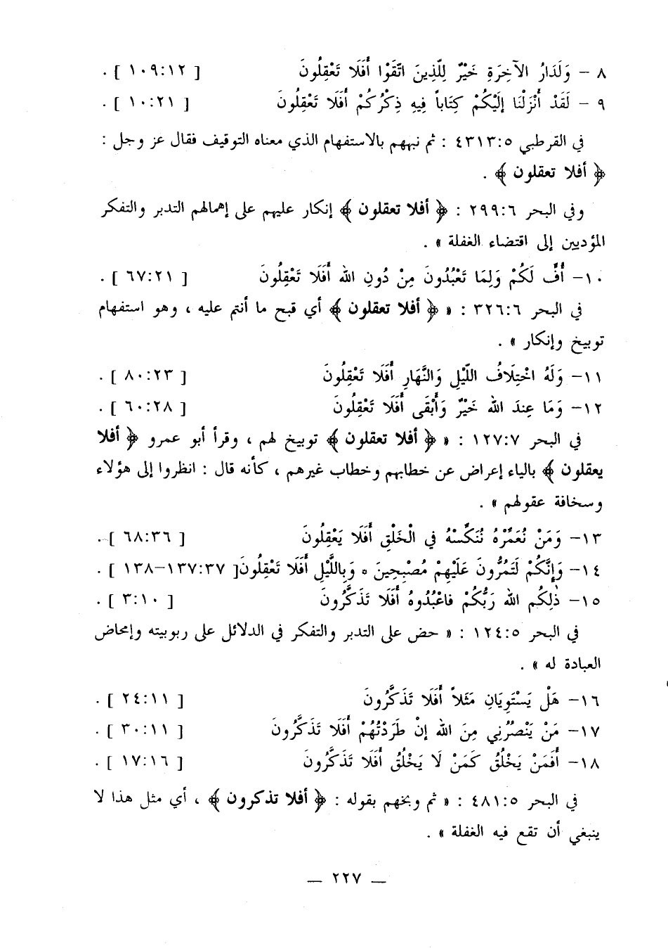 9 - {لقد أنزلنا إليكم كتابا فيه ذكركم أفلا تعقلون} [21: 10]. في القرطبي [5: 4313]: ثم نبههم بالاستفهام الذي معناه التوقيف فقال عز وجل {أفلا تعقلون}. وفي البحر [6: 299]: {أفلا تعقلون} إنكار عليهم على إهمالهم التدبر والتفكر المؤديين إلى اقتضاء الغفلة».