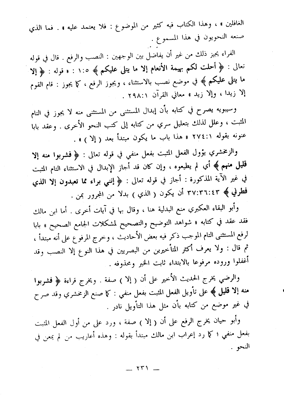 وأبو البقاء العكبري منع البدلية هنا، وقال بها في آيات أخرى. أما ابن مالك فقد عقد في كتابه «شواهد التوضيح والتصحيح لمشكلات الجامع الصحيح» بابا لرفع المستثنى التام الموجب ذكر فيه بعض الأحاديث، وخرج المرفوع على أنه مبتدأ، ثم قال: ولا يعرف أكثر المتأخرين من البصريين في هذا النوع إلا النصب وقد أغفلوا وروده بالابتداء ثابت الخبر ومحذوفه.