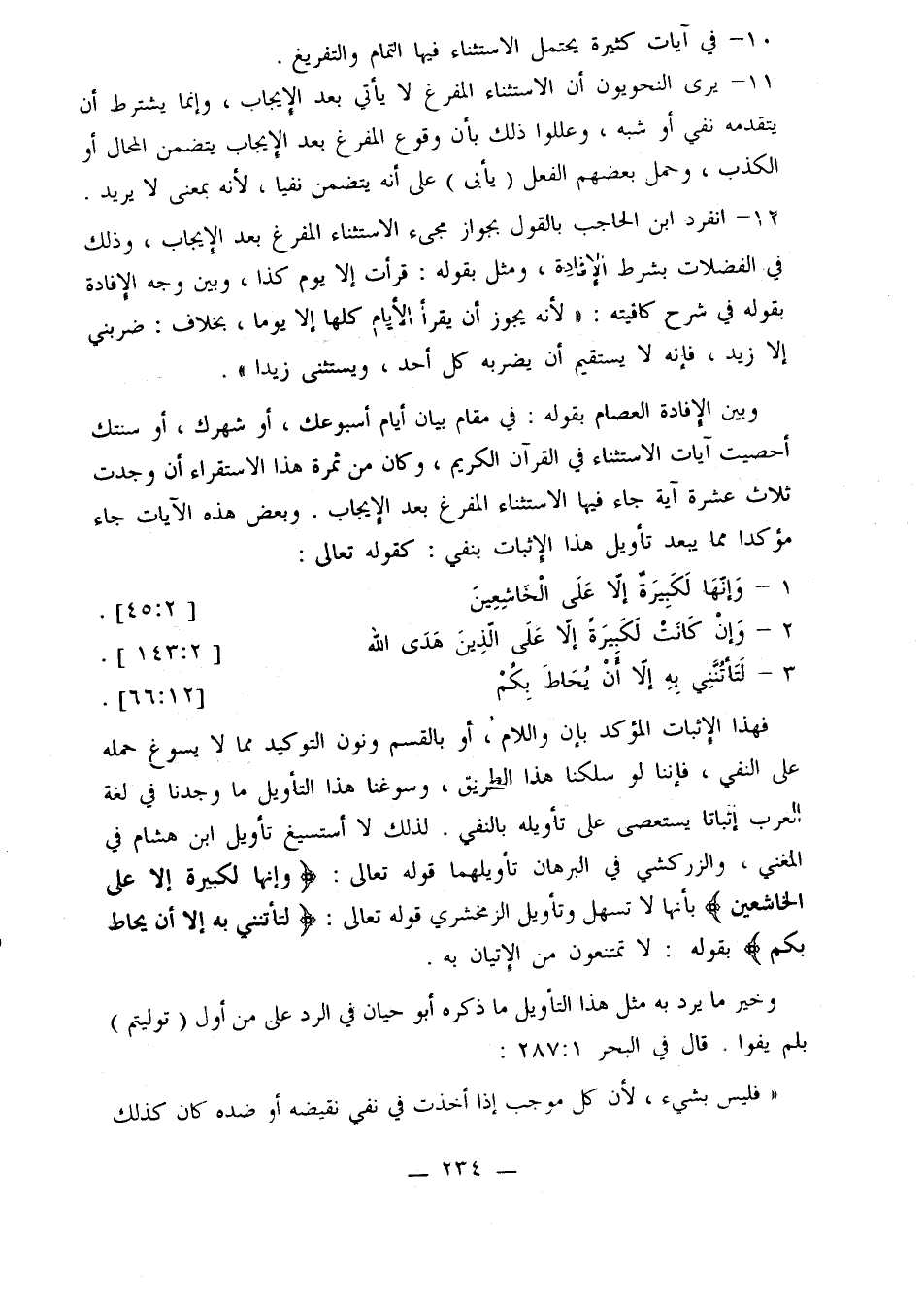 وبين الإفادة العصام بقوله: في مقام بان أيام أسبوعك، أو شهرك، أو سنتك أحصيت آيات الاستثناء في القرآن الكريم، وكان من ثمرة هذا الاستقراء أن وجدت ثلاث عشرة آية جاء فيها الاستثناء المفرغ بعد الإيجاب، وبعض هذه الآيات جاء مؤكدا مما يبعد تأويل هذا الإثبات بنفي: كقوله تعالى: