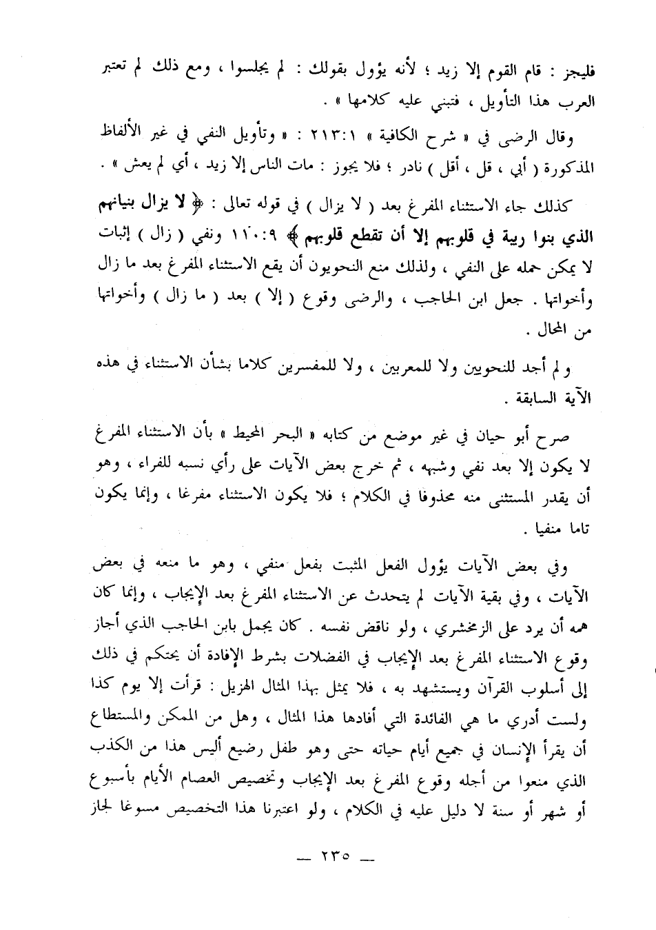 كذلك جاء الاستثناء المفرغ بعد (لا يزال) في قوله تعالى: {لا يزال بنيانهم الذي بنوا ريبة في قلوبهم إلا أن تقطع قلوبهم} [9: 110] ونفي (زال) إثبات لا يمكن حمله على النفي، ولذلك منع النحويون أن يقع الاستثناء المفرغ بعد ما زال وأخواتها. جعل ابن الحاجب، والرضي وقوع (إلا) بعد (ما زال) وأخواتها من المحال.