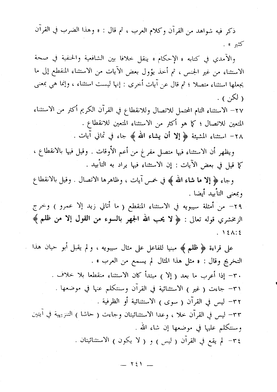 27 - الاستثناء التام المحتمل للاتصال وللانقطاع في القرآن الكريم أكثر من الاستثناء المتعين للاتصال؛ كما هو أكثر من الاستثناء المتعين للانقطاع.