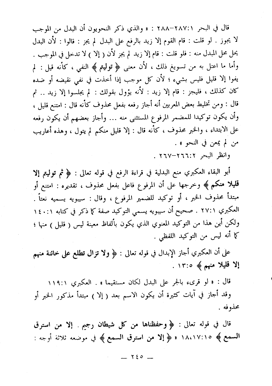 قال: «لو قرئ بالجر على البدل لكان مستقيما» العكبري [1: 119] وقد أجاز في آيات كثيرة أن يكون الاسم بعد (إلا) مبتدأ مذكور الخبر أو محذوفه.
