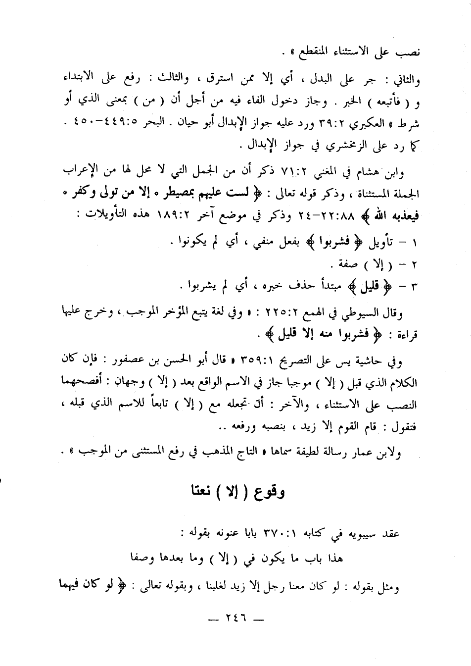 وابن هشام في المغني [2: 71] ذكر أن من الجمل التي لا محل لها من الإعراب الجملة المستثناة، وذكر قوله تعالى: {لست عليهم بمصيطر* إلا من تولى وكفر* فيعذبه الله} [88: 22 - 24]. وذكر في موضع آخر [2: 189] هذه التأويلات: