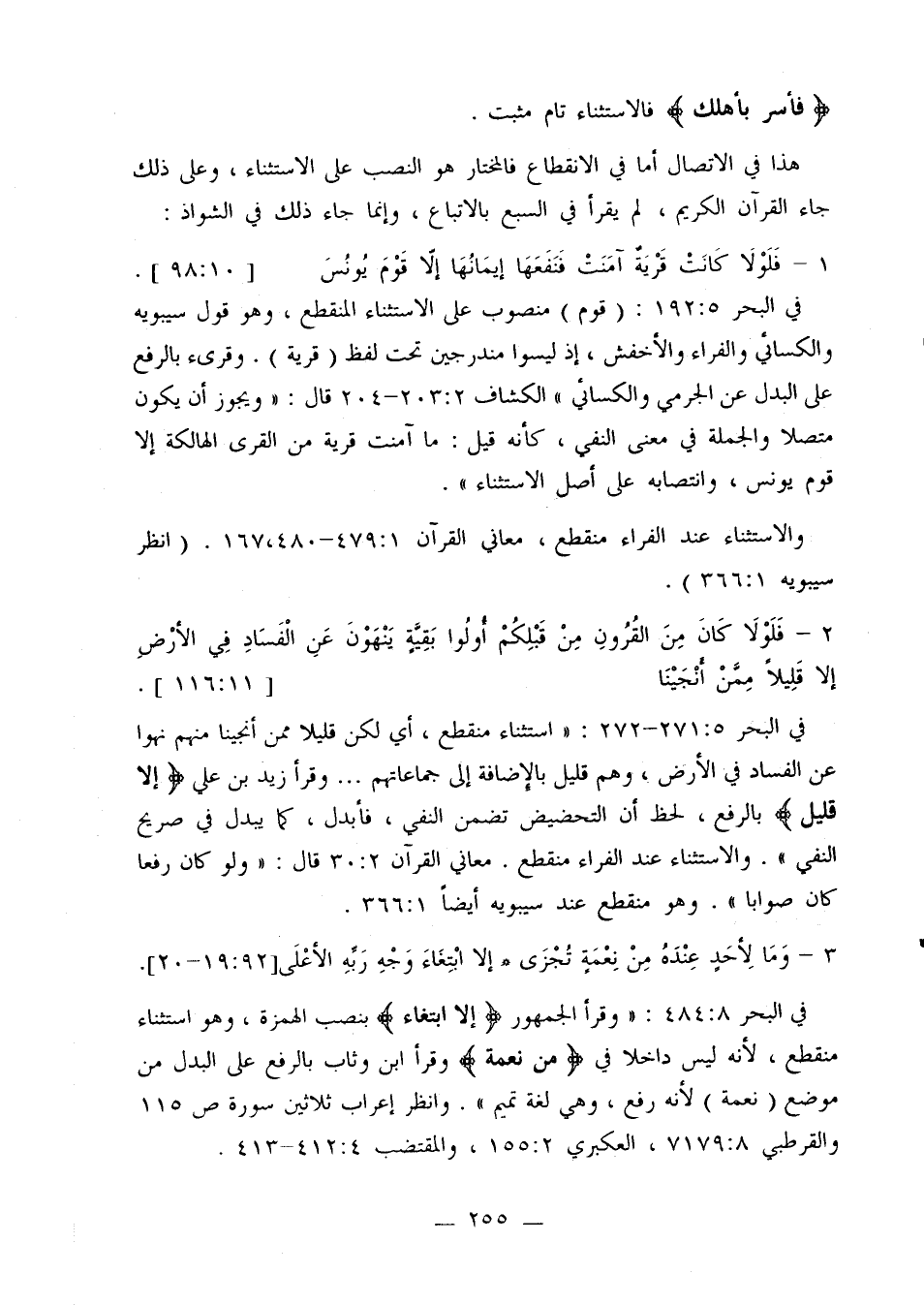 2 - {فلولا كان من القرون من قبلكم أولوا بقية ينهون عن الفساد في الأرض إلا قليلا ممن أنجينا} [11: 116]. في البحر 5: 271 - 272: «استثناء منقطع، أي لكن قليلا ممن أنجينا منهم نهوا عن الفساد في الأرض، هم قليل بالإضافة إلى جماعاتهم .. وقرأ زيد بن علي {إلا قليل} بالرفع، لحظ أن التحضيض تضمن النفي، فأبدل، كما يدل في صريح النفي». والاستثناء عند الفاء منقطع، معاني القرآن 2: 30: قال «ولو كان رفعا كان صوابا». وهو منقطع عند سيبويه أيضًا 1: 366.