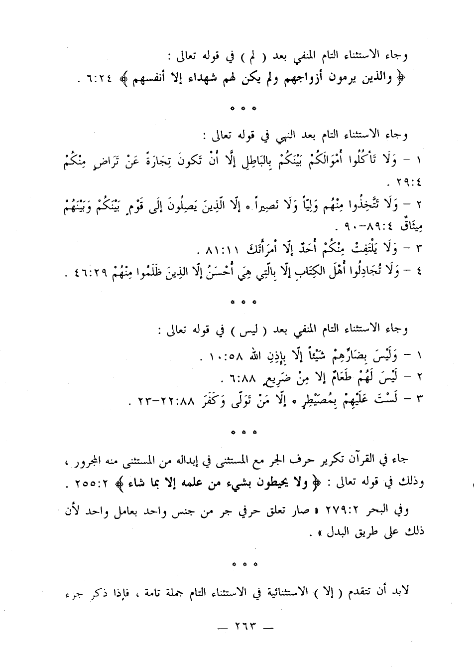 جاء في القرآن تكرير حرف الجر مع المستثنى في إبداله من المستثنى منه المجرور، وذلك في قوله تعالى: {ولا يحيطون بشيء من علمه إلا بما شاء} [2: 255].