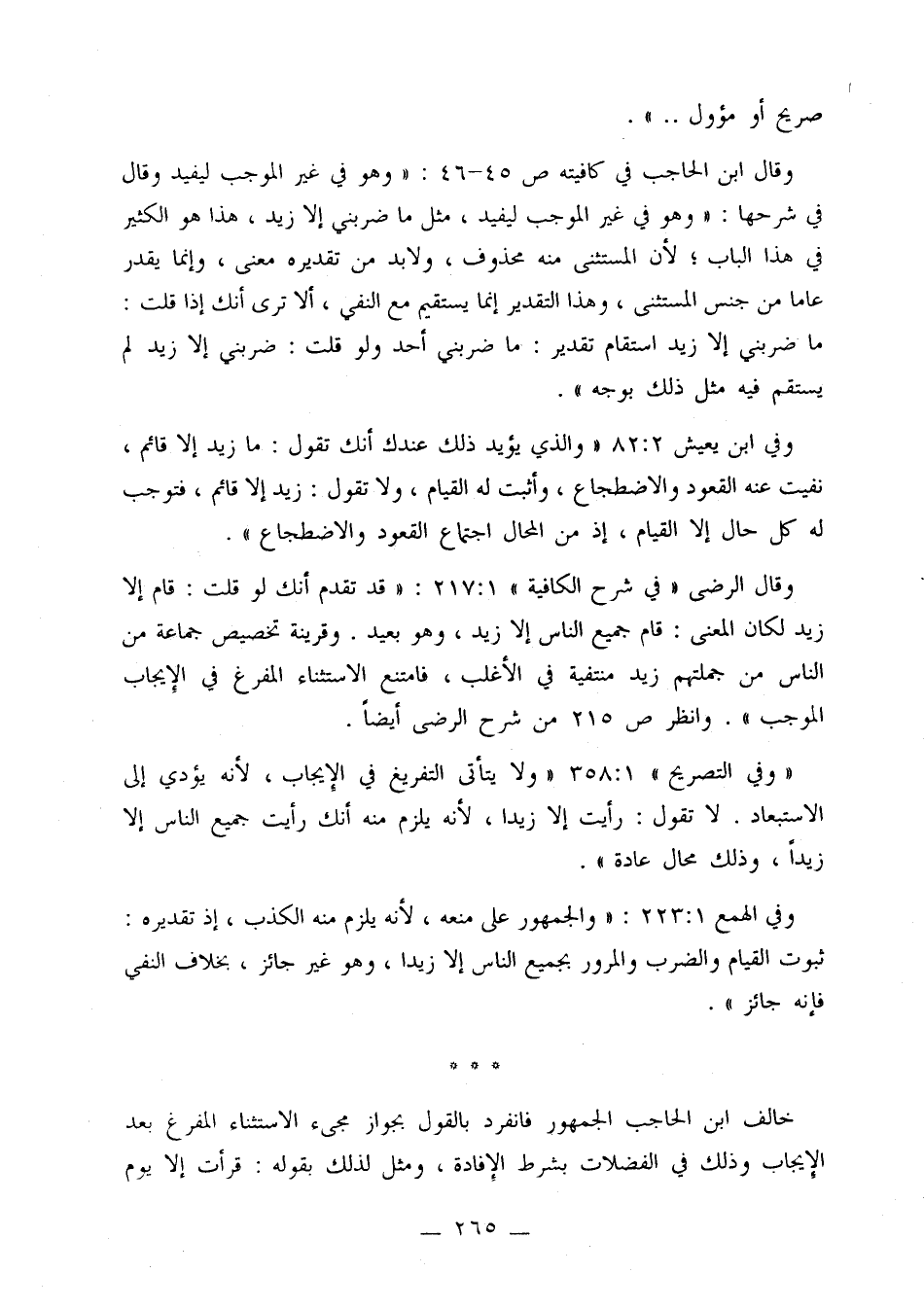 وقال الرضي «في شرح الكافية» 1: 217: «قد تقدم أنك لو قلت: قام إلا زيد لكان المعنى: قام جميع الناس إلا زيد، وهو بعيد، وقرينة تخصيص جماعة من الناس من جملتهم زيد منتفية في الأغلب، فامتنع الاستثناء المفرغ في الإيجاب الموجب». وانظر ص 215 من شرح الرضي أيضًا.