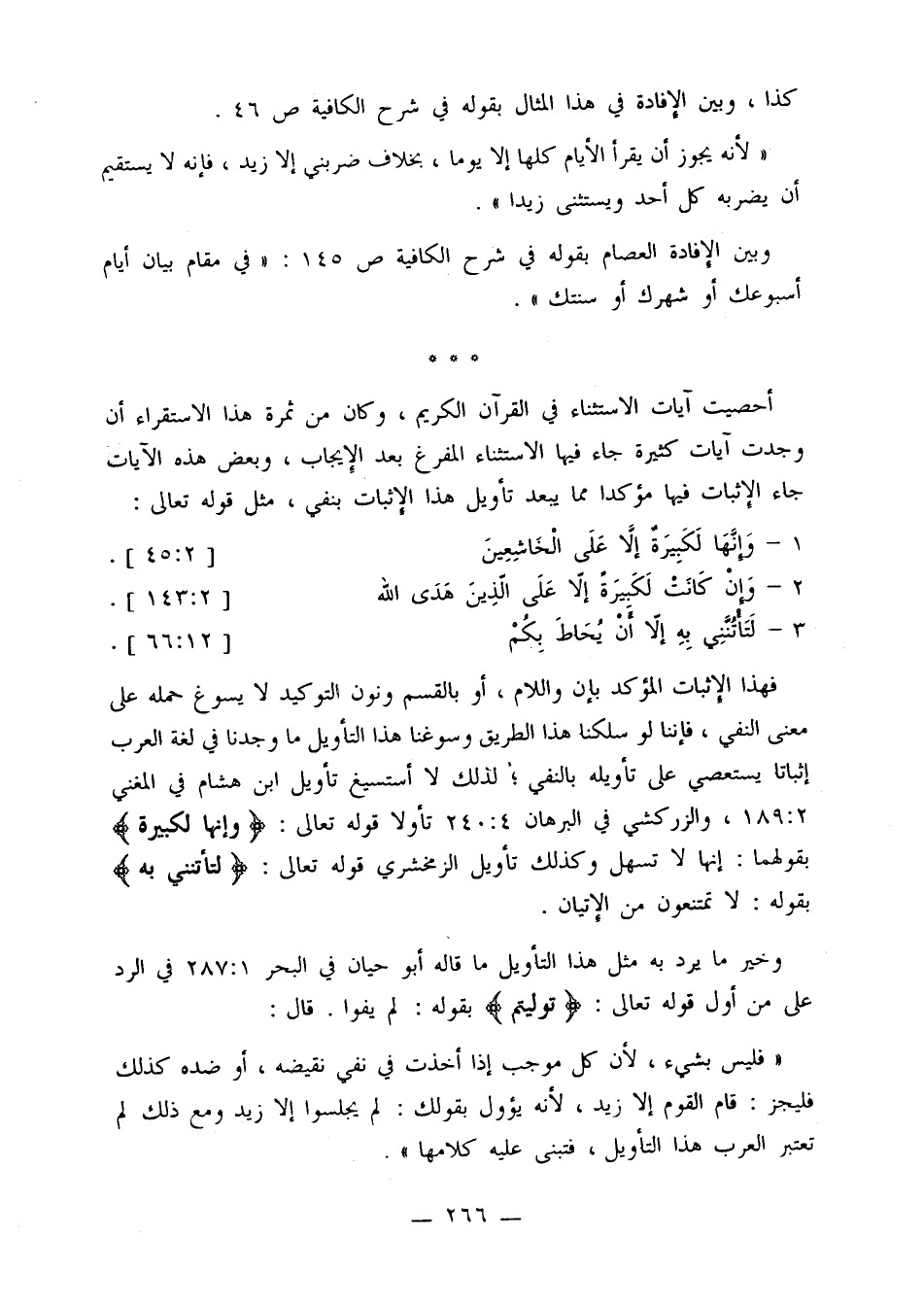 أحصيت آيات الاستثناء في القرآن الكريم، وكان من ثمرة هذا الاستقراء أن وجدت آيات كثيرة جاء فيها الاستثناء المفرغ بعد الإيجاب، وبعض هذه الآيات جاء الإثبات فيها مؤكدا مما يبعد تأويل هذا الإثبات بنفي، مثل قوله تعالى: