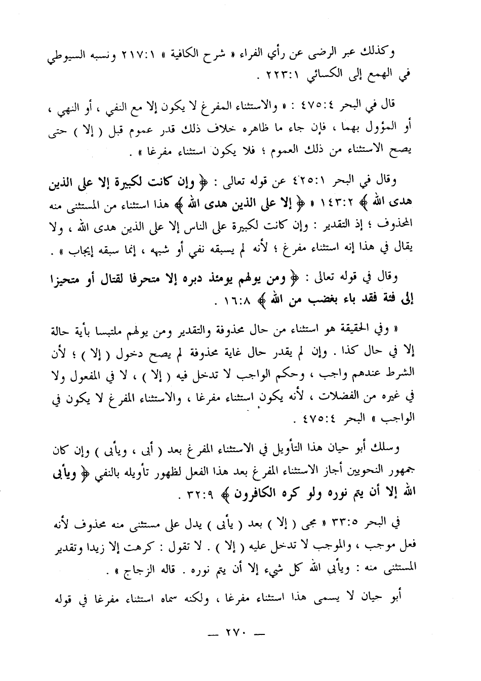 وقال في البحر 1: 425 عن قوله تعالى: {وإن كانت لكبيرة إلا على الذين هدى الله} [2: 143]. «{إلا على الذين هدى الله} هذا استثناء من المستثنى منه المحذوف؛ إذ التقدير: وإن كانت لكبيرة على الناس إلا على الذين هدى الله، ولا يقال في هذا إنه استثناء مفرغ؛ لأنه لم يسبقه نفي أو شبهه، إنما سبقه إيجاب».