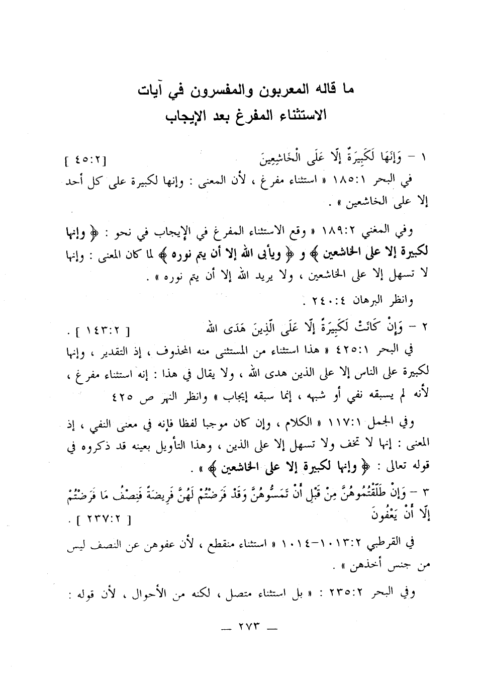 وفي الجمل 1: 117: «الكلام، وإن كان موجبا لفظا فإنه في معنى النفي، إذا المعنى: إنها لا تخف ولا تسهل إلا على الذين، وهذا التأويل بعينه قد ذكروه في قوله تعالى: {وإنها لكبيرة إلا على الخاشعين}».