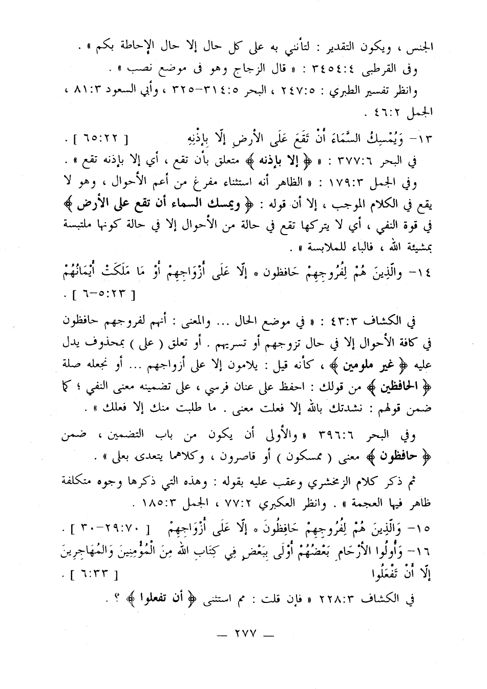 وفي الجمل 3: 179: «الظاهر أنه استثناء مفرغ من أعم الأحوال، وهو لا يقع في الكلام الموجب، إلا أن قوله: {ويمسك السماء أن تقع على الأرض} في قوة النفي، أي لا يتركها تقع في حالة من الأحوال إلا في حالة كونها ملتبسة بمشيئة الله، فالباء للملابسة».