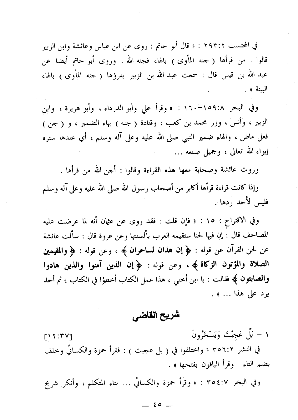 في المحتسب 2: 293: «قال أبو حاتم: روى عن ابن عباس وعائشة وابن الزبير قالوا: من قرأها (جنة المأوى) بالهاء فجنة الله. وروى أبو حاتم أيضًا عن عبد الله بن قيس قال: سمعت عبد الله بن الزبير يقرؤها (جنه المأوى) بالهاء البينة».
