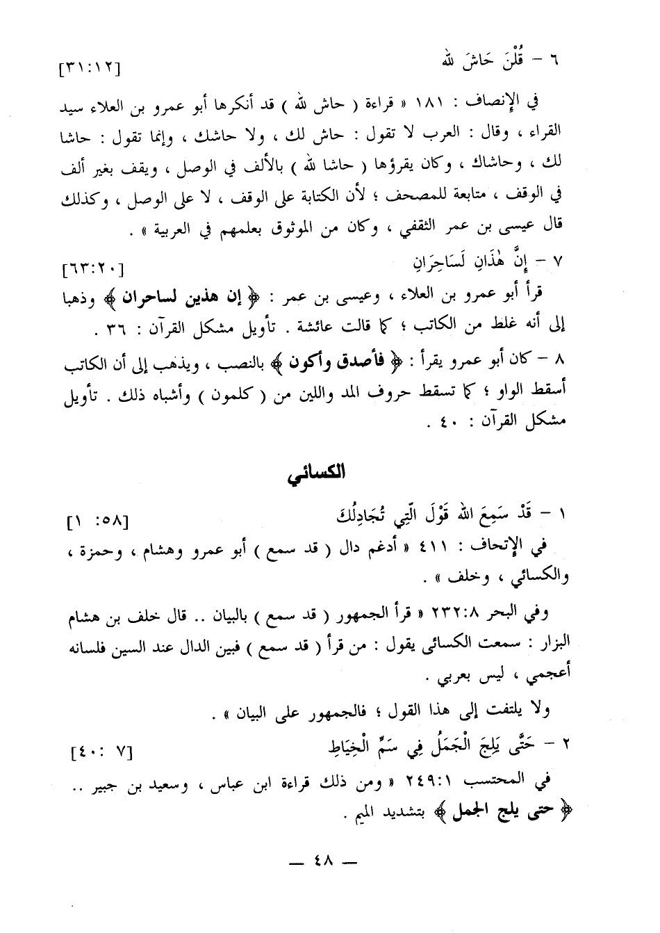 في الإنصاف: 181 «قراءة (حاش لله) قد أنكرها أبو عمرو بن العلاء سيد القراء، وقال: العرب لا تقول: حاش لك، ولا حاشك، وإنما تقول: حاشا لك، وحاشاك، وكان يقرؤها (حاشا لله) بالألف في الوصل، ويقف بغير ألف في الوقف، متابعة للمحصف؛ لأن الكتابة على الوقف، لا على الوصل، وكذلك قال عيسى بن عمر الثقفي، وكان من الموثوق بعلمهم في العربية».