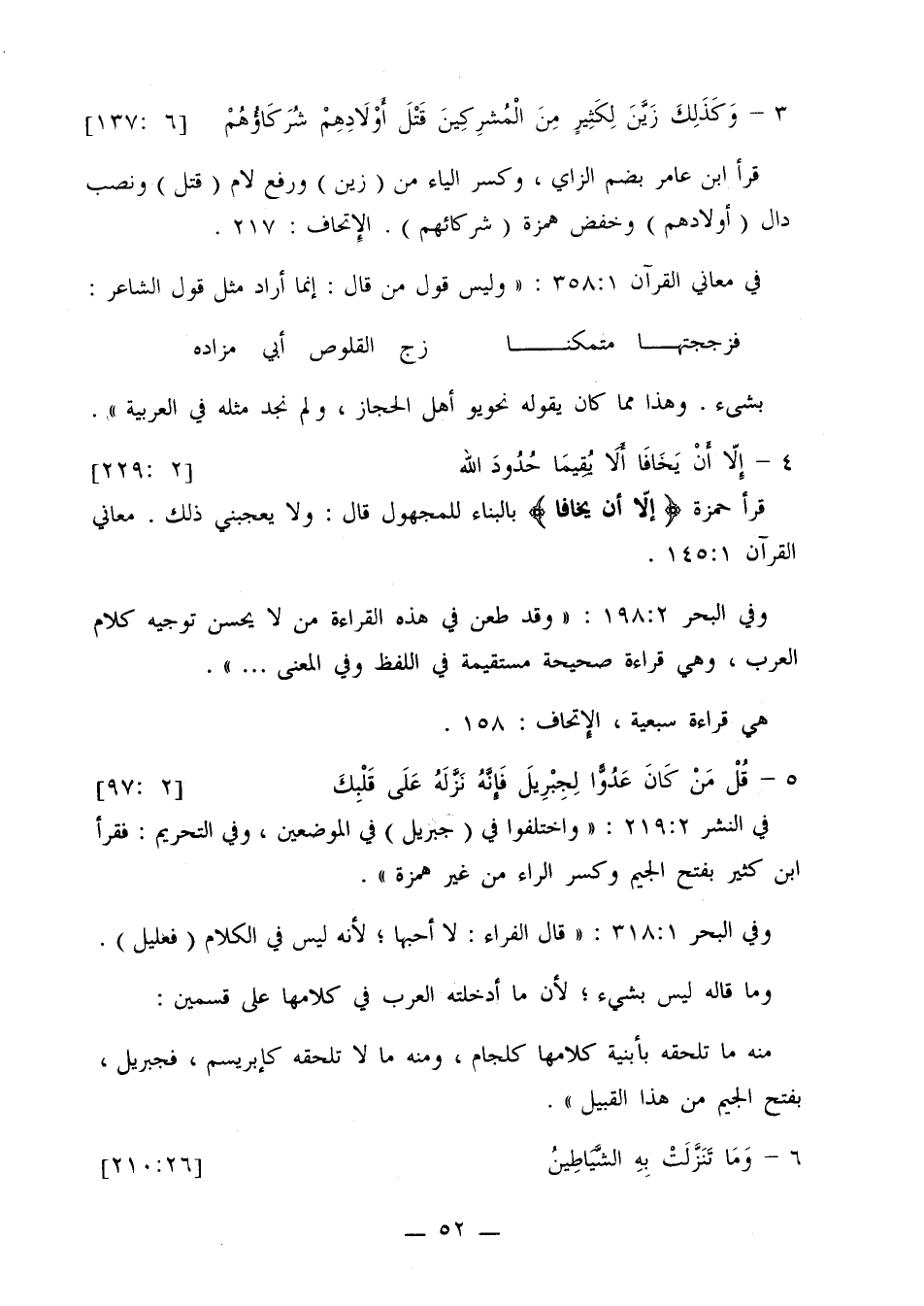 في النشر 2: 219: «واختلفوا في (جبريل) في الموضعين، وفي التحريم: فقرأ ابن كثير بفتح الجيم وكسر الراء من غير همزة».