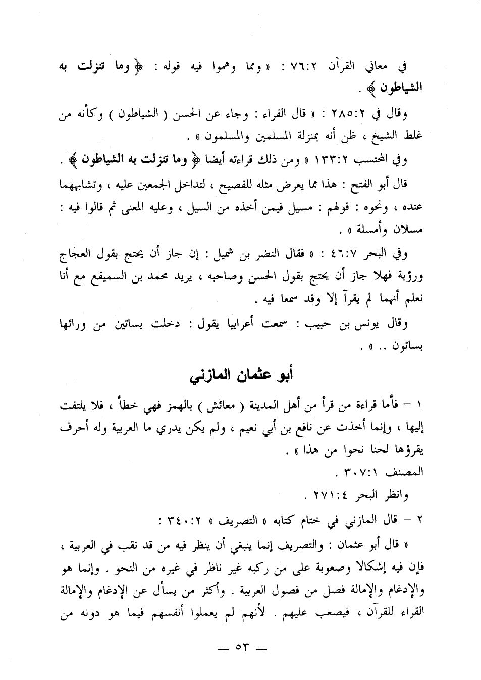 «قال أبو عثمان: والتصريف إنما ينبغي أن ينظر فيه من قد نقب في العربية، فإن فيه إشكالاً وصعوبة على من ركبه غير ناظر في غيره من النحو. وإنما هو والإدغام والإمالة فصل من فصول العربية. وأكثر من يسأل عن الإدغام والإمالة القراء للقرآن، فيصعب عليهم. لأنهم لم يعملوا أنفسهم فيما هو دونه من