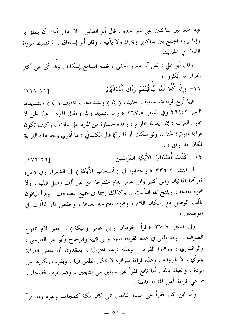 وفي البحر 7: 37 «قرأ الحرميان وابن عامر (ليكة) بغير لام ممنوع الصرف ... وقد طعن في هذه القراءة المبرد وابن قتيبة والزجاج وأبو علي الفارسي، والزمخشري، ووهموا القراء ... وهذه نزعة اعتزالية، يعتقدون أن بعض القراءة بالرأي، لا بالرواية. وهذه قراءة متواترة لا يمكن الطعن فيها، ويقرب إنكارها من الردة، والعياذ بالله. أما نافع فقرأ على سبعين من التابعين، وهم عرب فصحاء، ثم هي قراءة أهل المدينة قاطبة.