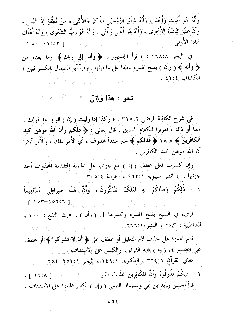 في شرح الكافية للرضي 2: 325: «وكذا إذا وليت [إن] الواو بعد قولك: هذا أو ذاك، تقريرا للكلام السابق. قال تعالى: {ذلكم وأن الله موهن كيد الكافرين} 8: 18 {فذلكم} خبر مبتدأ محذوف، أي الأمر ذلك، والأمر أيضا أن الله موهن كيد الكافرين.