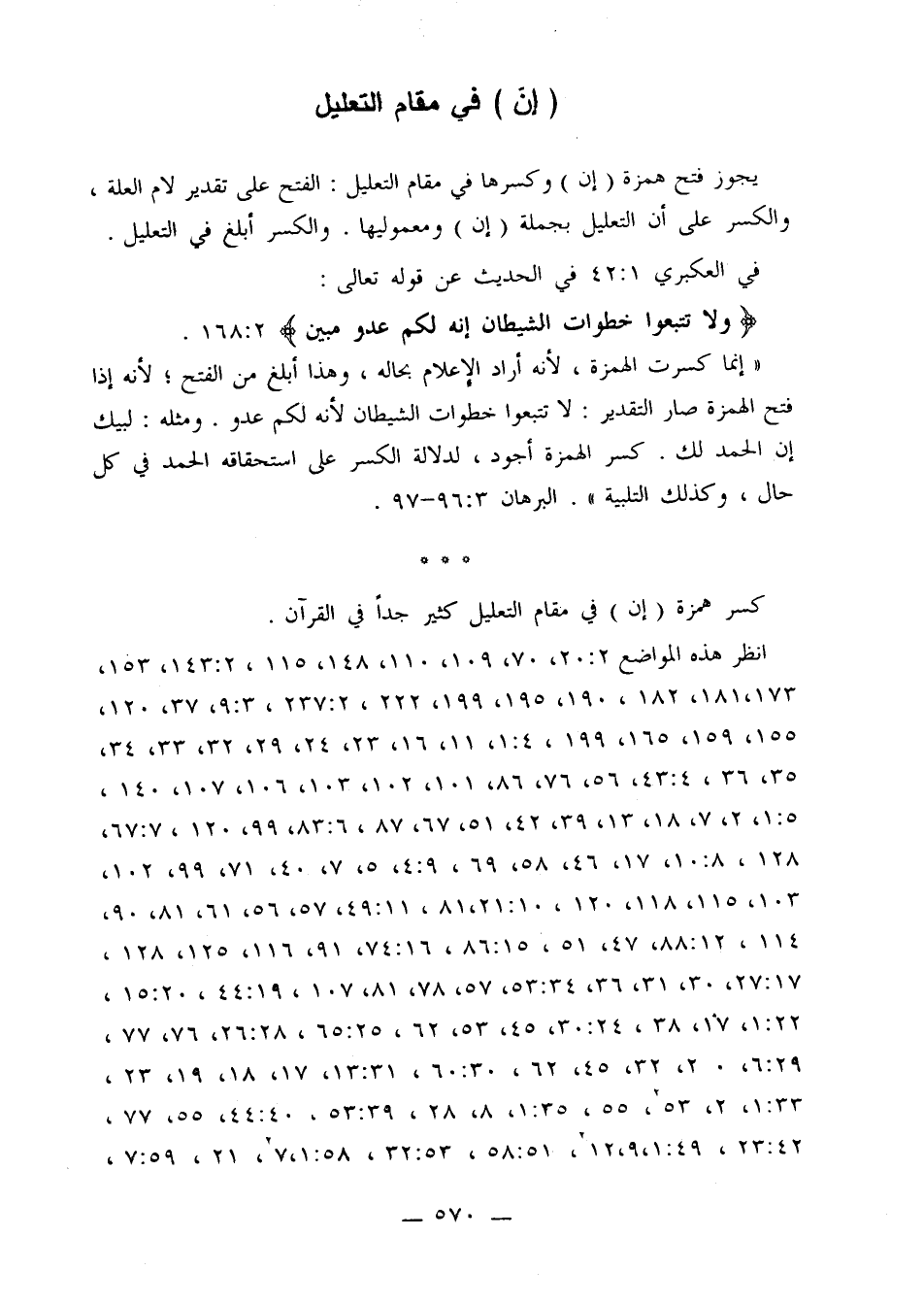 «إنما كسرت الهمزة، لأنه أراد الإعلام بحاله، وهذا أبلغ من الفتح؛ لأنه إذا فتح الهمزة صار التقدير: لا تتبعوا خطوات الشيطان لأنه لكم عدو. ومثله: لبيك إن الحمد لك. كسر الهمزة أجود، لدلالة الكسر على استحقاقه الحمد في كل حال، وكذلك التلبية». البرهان 3: 96 - 97.