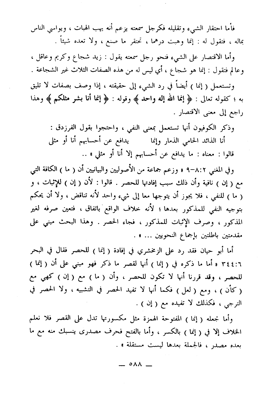 وفي المغني 2: 8 - 9 «وزعم جماعة من الأصوليين والبيانيين أن [ما] الكافة التي مع [إن] نافية وأن ذلك سبب إفادتها للحصر. قالوا: لأن [إن] للإثبات، و [ما] للنفي، فلا يجوز أن يتوجها معا إلى شيء واحد لأنه تناقض، ولا أن يحكم بتوجيه النفي للمذكور بعدها؛ لأنه خلاف الواقع باتفاق، فتعين صرفه لغير المذكور، وصرف الإثبات للمذكور، فجاء الحصر. وهذا البحث مبني على مقدمتين باطلتين بإجماع النحويين ..».