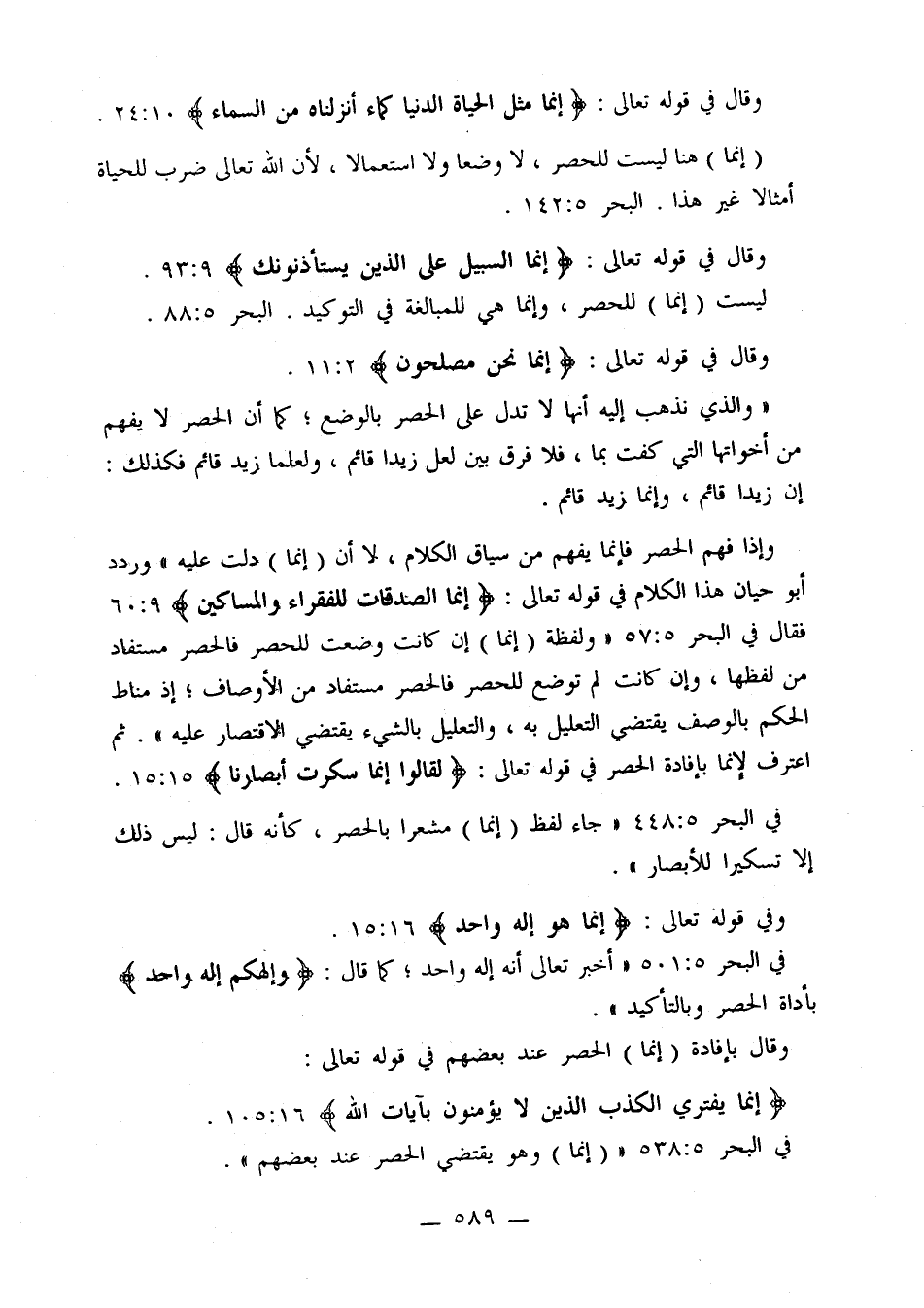 وإذا فهم الحصر فإنما يفهم من سياق الكلام، لا أن [إنما] دلت عليه» وردد أبو حيان هذا الكلام في قوله تعالى: {إنما الصدقات للفقراء والمساكين} 9: 60 فقال في البحر 5: 57 «ولفظة [إنما] إن كانت وضعت للحصر فالحصر مستفاد من لفظها، وإن كانت لم توضع للحصر فالحصر مستفاد من الأوصاف؛ إذ مناط الحكم بالوصف يقتضي التعليل به، والتعليل بالشيء يقتضي الاقتصار عليه». ثم اعترف لإنما بإفادة الحصر في قوله تعالى: {لقالوا إنما سكرت أبصارنا} 15: 15.