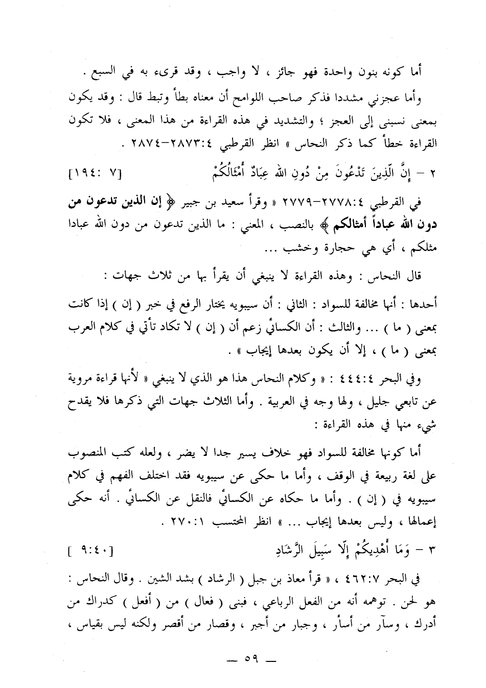 أحدها: أنها مخالفة للسواد: الثاني: أن سيبويه يختار الرفع في خبر (إن) إذا كانت بمعنى (ما) ... والثالث: أن الكسائي زعم أن (إن) لا تكاد تأتي في كلام العرب معنى (ما)، إلا أن يكون بعدها إيجاب».