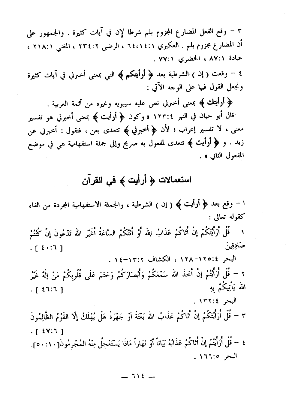 1 - وقع بعد {أرأيت} [إن] الشرطية، والجملة الاستفهامية المجردة من الفاء كقوله تعالى: