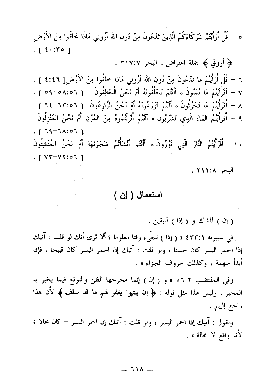 وفي المقتضب 2: 56 «و [إن] إنما مخرجها الظن والتوقع فيما يخبر به المخبر. وليس هذا مثل قوله: {إن ينتهوا يغفر لهم ما قد سلف} لأن هذا راجع إليهم.