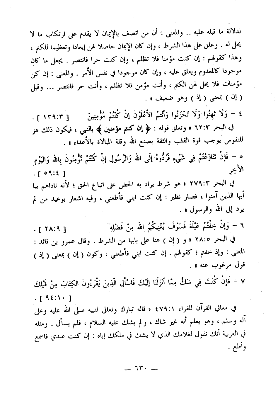 في معاني القرآن للفراء 1: 479 «قاله تبارك وتعالى لنبيه صلى الله عليه وعلى آله وسلم، وهو يعلم أنه غير شاك، ولم يشك عليه السلام، فلم يسأل. ومثله في العربية أنك تقول لغلامك الذي لا يشك في ملكك إياه: إن كنت عبدي فاسمع وأطع.