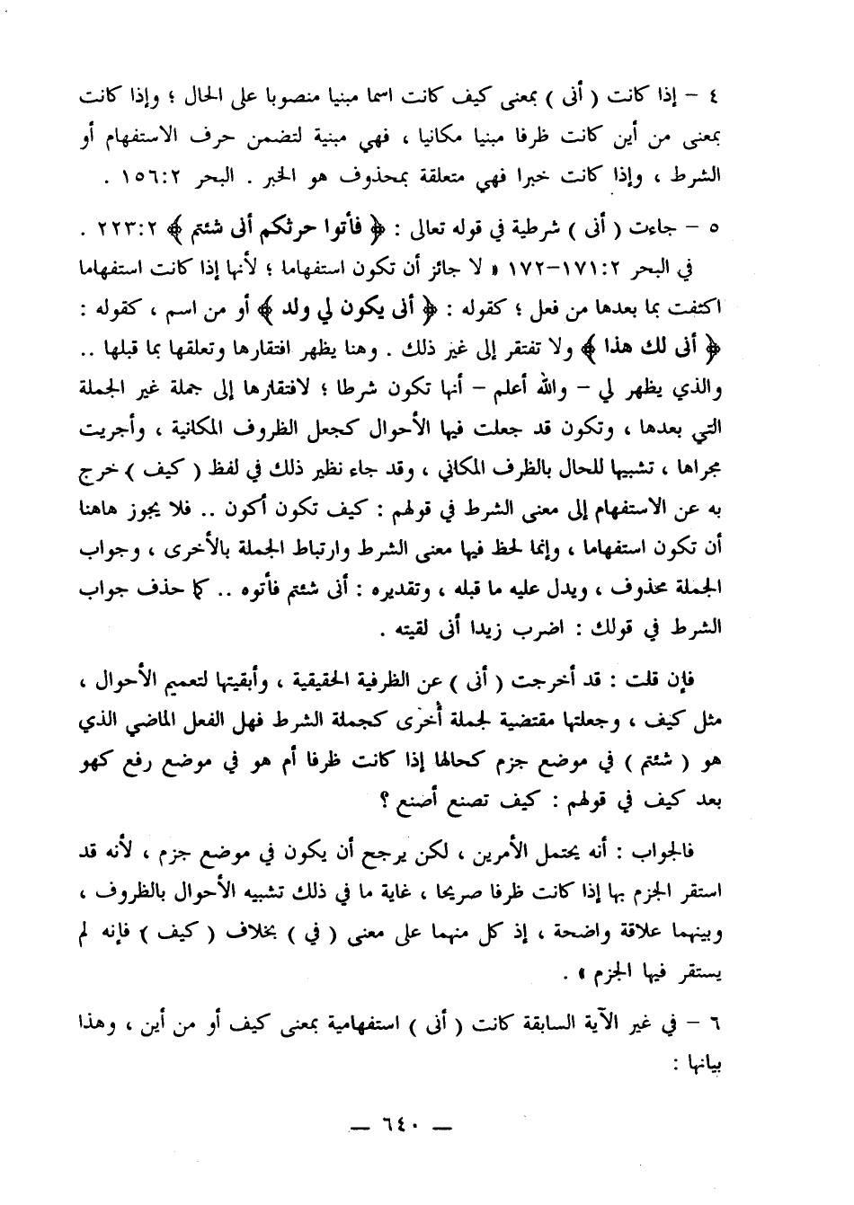 في البحر 2: 171 - 172 «لا جائز أن تكون استفهاما؛ لأنها إذا كانت استفهاما اكتفت بما بعدها من فعل؛ كقوله: {أنى يكون لي ولد} أو من اسم، كقوله: {أنى لك هذا} ولا تفتقر إلى غير ذلك. وهنا يظهر افتقارها وتعلقها بما قبلها ..