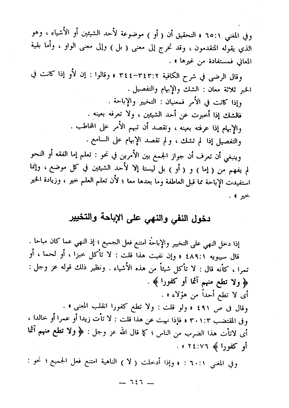 وفي المقتضب 3: 301 «فإذا نهيت عن هذا قلت: لا تأت زيدا أو عمرا أو خالدا، أي لا تأت هذا الضرب من الناس؛ كما قال الله عز وجل: {ولا تطع منهم آثما أو كفورا} 76: 24».