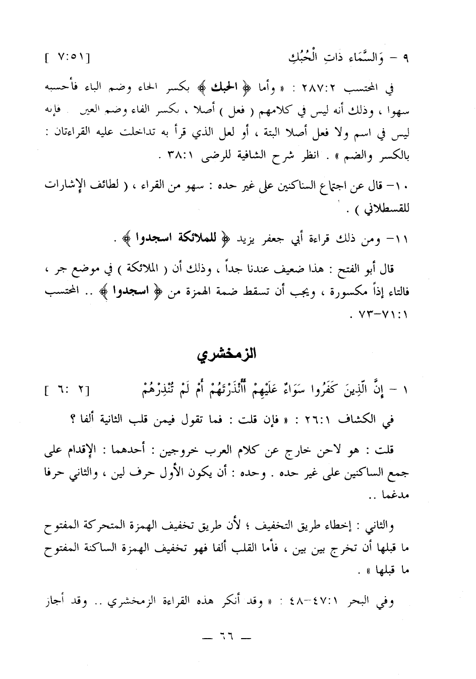 10 - قال عن اجتماع الساكنين على غير حده: سهو من القراء، (لطائف الإشارات للقسطلاني).