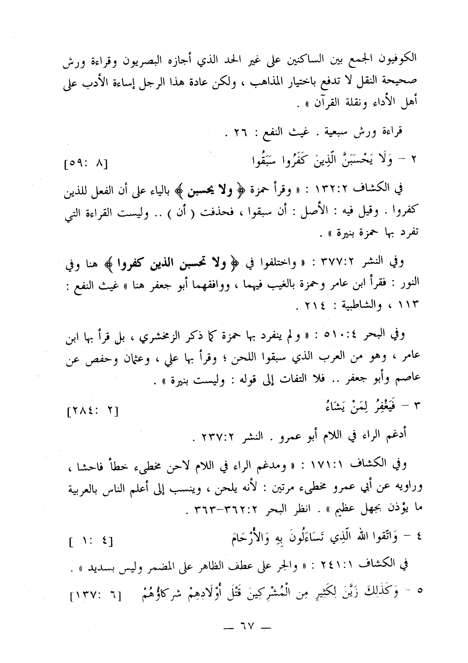 الكوفيون الجمع بين الساكنين على غير الحد الذي أجازه البصريون وقراءة ورش صحيحة النقل لا تدفع باختيار المذاهب، ولكن عادة هذا الرجل إساءة الأدب على أهل الأداء ونقلة القرآن».