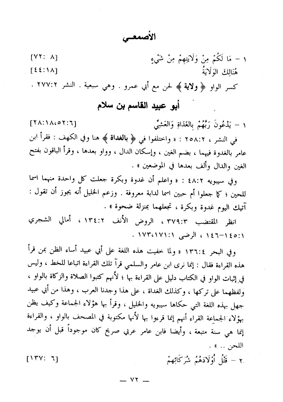وفي البحر 4: 136 «ولما خفيت هذه اللغة على أبي عبيد أساء الظن بمن قرأ هذه القراءة فقال: إنما نرى ابن عامر والسلمي قرآ تلك القراءة اتباعًا للخط، وليس في إثبات الواو في الكتاب دليل على القراءة بها؛ لأنهم كتبوا الصلاة والزكاة بالواو، ولفظهما على تركها، وكذلك الغداة، على هذا وجدنا العرب، وهذا من أبي عبيد جهل بهذه اللغة التي حكاها سيبويه والخليل، وقرأ بها هؤلاء الجماعة وكيف يظن بهؤلاء الجماعة أنهم إنما قرءوا بها لأنها مكتوبة في المصحف بالواو، والقراءة إنما هي سنة متبعة، وأيضًا فابن عامر عربي صريح كان موجودًا قبل أن يوجد اللحن ...».