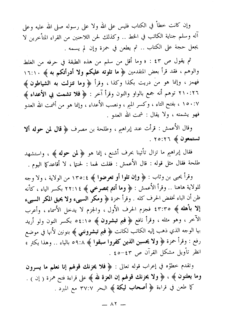 ثم يقول ص 43: «وما أقل من سلم من هذه الطبقة في حرفه من الغلط والوهم، فقد قرأ بعض المتقدمين {ما تلوته عليكم ولا أدرأتكم به} 10: 16 فهمز، وإنما هو من دريت بكذا وكذا، وقرأ {وما تنزلت به الشياطون} 26: 210 توهم أنه جمع بالواو والنون وقرأ آخر: {فلا تشمت بي الأعداء} 7: 150، بفتح التاء، وكسر الميم، ونصب الأعداء، وإنما هو من أشمت الله العدو فهو يشمته، ولا يقال: شمت الله العدو.