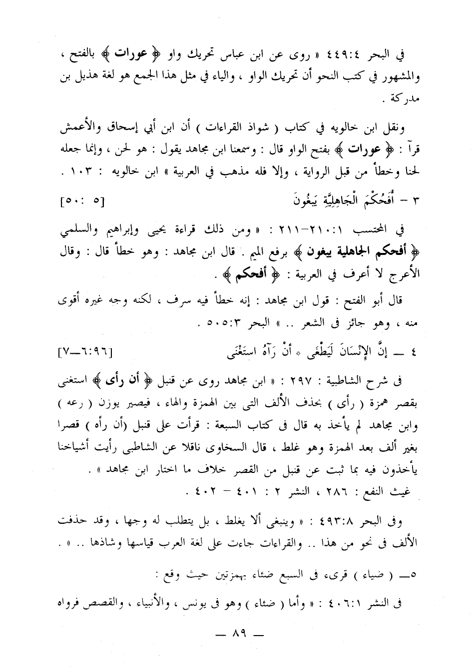 في المحتسب 1: 210 - 211: «ومن ذلك قراءة يحييى وإبراهيم والسلمي {أفحكم الجاهلية يبغون} برفع الميم. قال ابن مجاهد: وهو خطأ قال: وقال الأعرج لا أعرف في العربية: {أفحكم}.