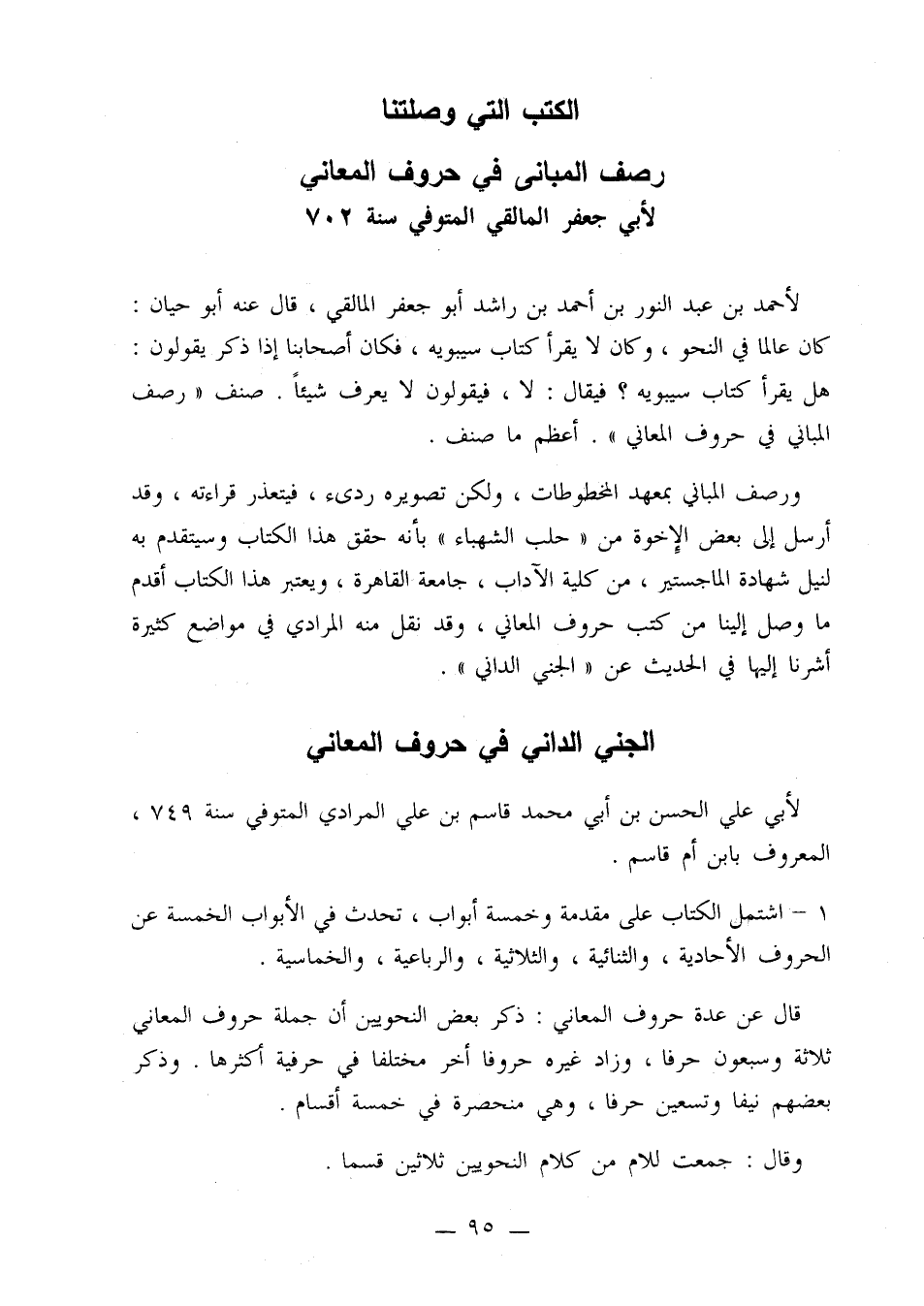 لأحمد بن عبد النور بن أحمد بن راشد أبو جعفر المالقي، قال عنه أبو حيان: كان عالمًا في النحو، وكان لا يقرأ كتاب سيبويه، فكان أصحابنا إذا ذكر يقولون: هل يقرأ كتاب سيبويه؟ فقال: لا، فيقولون لا يعرف شيئًا. صنف «رصف المباني في حروف المعاني». أعظم ما صنف.