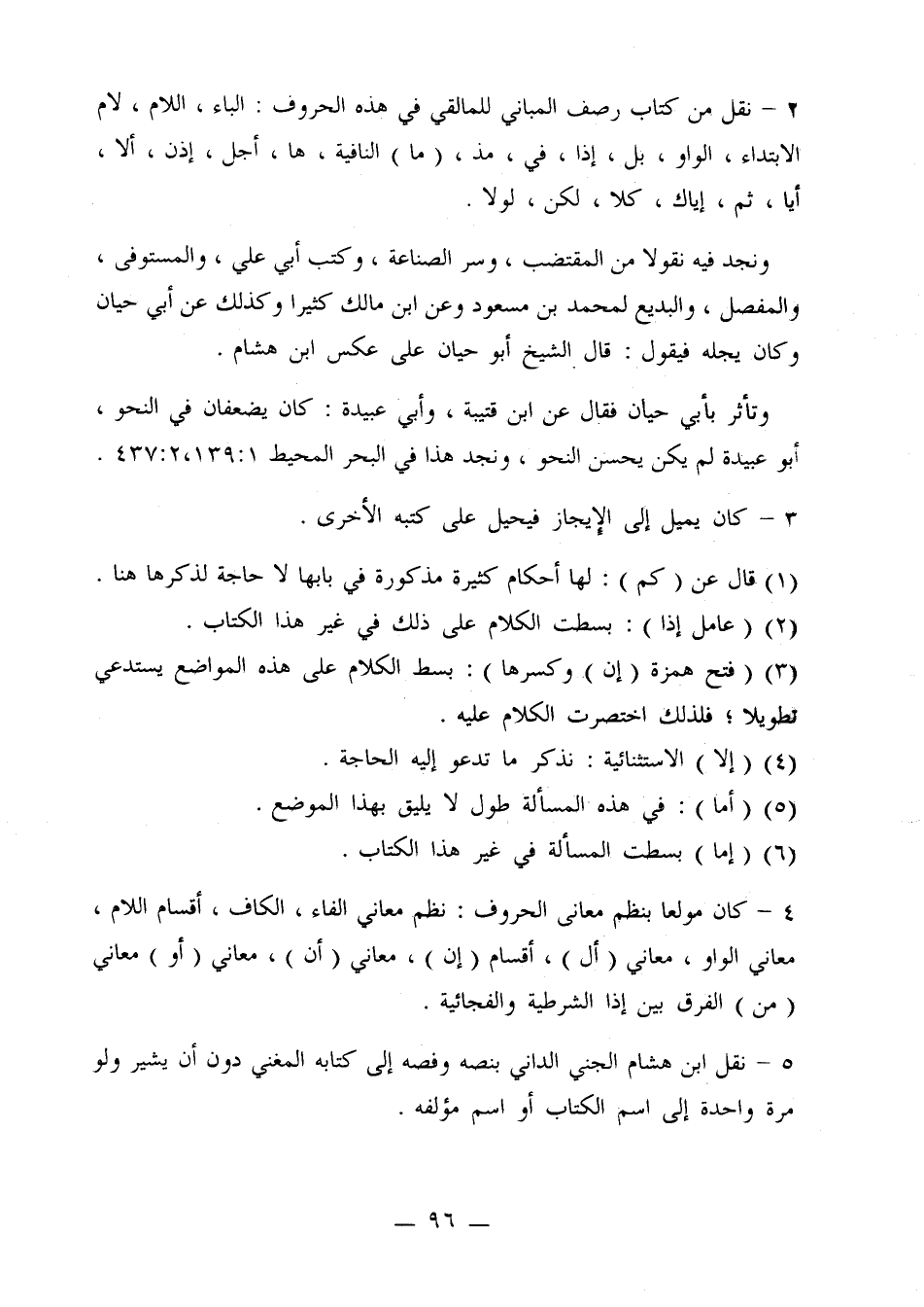 5 - نقل ابن هشام الجني الداني بنصه وفصه إلى كتابه المغني دون أن يشير ولو مرة واحدة إلى اسم الكتاب أو اسم مؤلفه.