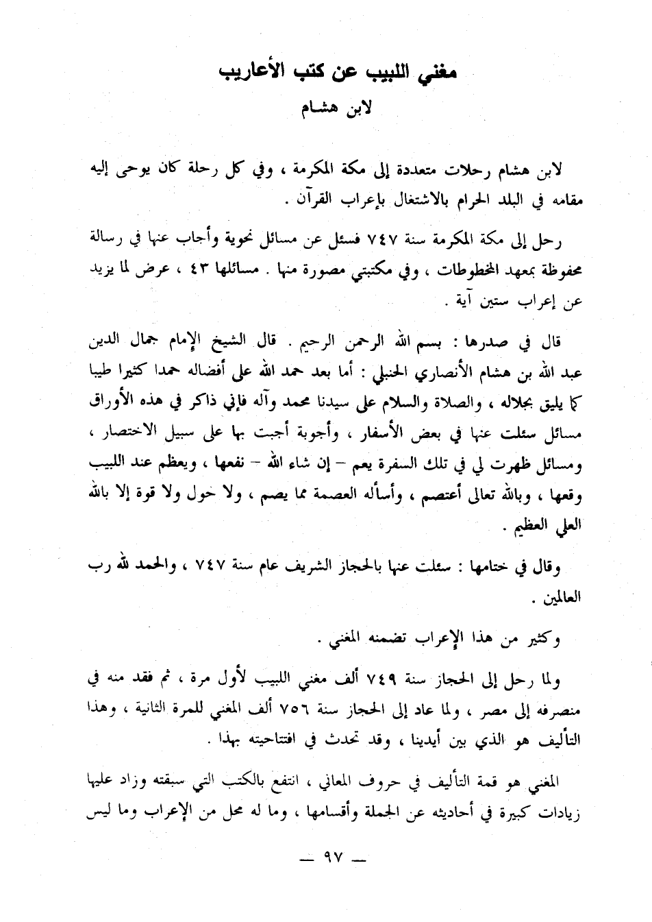 قال في صدرها: بسم الله الرحمن الرحيم. قال الشيخ الإمام جمال الدين عبد الله بن هشام الأنصاري الحنبلي: أما بعد حمد الله على أفضاله حمدًا كثيرًا طيبًا كما يليق بجلاله، والصلاة والسلام على سيدنا محمد وآله فإني ذاكر في هذه الأوراق مسائل سئلت عنها في بعض الأسفار، وأجوبة أجبت بها على سبيل الاختصار، ومسائل ظهرت لي في تلك السفرة يعم - إن شاء الله - نفعها، ويعظم عند اللبيب وقعها، وبالله تعالى أعتصم، وأسأله العصمة مما يصم، ولا خول ولا قوة إلا بالله العلي العظيم.