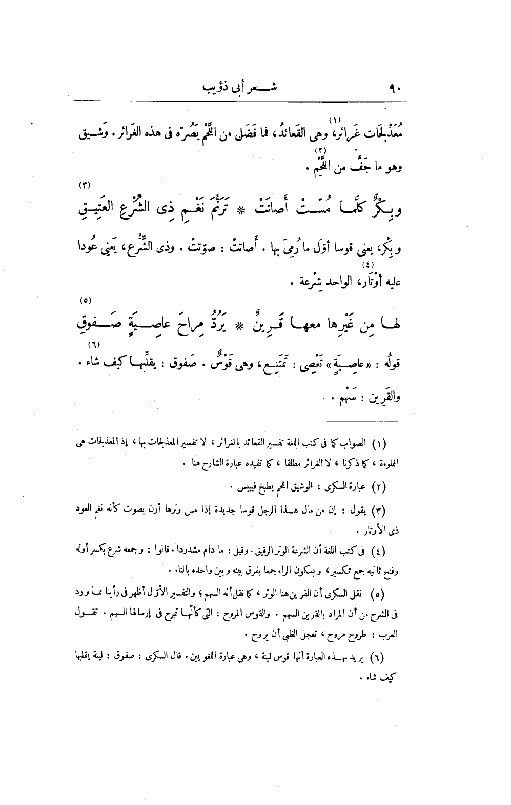 (¬5) نقل السكري أن القرين هنا الوتر، كما نقل أنه السهم؛ والتفسير الأوّل أظهر في رأينا مما ورد في الشرح من أن المراد بالقرين السهم. والقوس المروح: التي كأنّها تمرح في إرسالها السهم. تقول العرب: طروح مروح، تعجل الظبي أن يروح.
