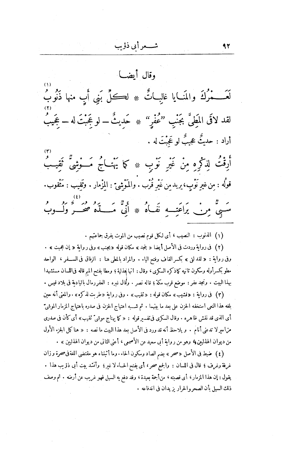 (¬3) في رواية: "قشيب" مكان قوله: "ثقيب". وفي رواية "طربت لذكره". والمعنى أنه حين بلغه هذا النعي استخفه الحزن على بعد ما بينهما. ثم شبه اهتياج الحزن في صدره باهتياج المزمار الموشيّ أي الذي قد نقش ظاهره. وقال السكري في تفسير قوله: "كما يهتاج موشيّ ثقيب" أي كأن في صدري مزامير لا تدعني أنام. ويلاحظ أنه قد ورد في الأصل بعد هذا البيت ما نصه: "هنا كمل الجزء الأول من ديوان الهذليين، وهو من رواية أبي سعيد عن الأصمعي، أعني الثاني من ديوان الهذليين".